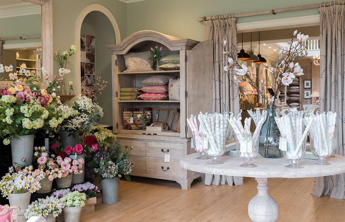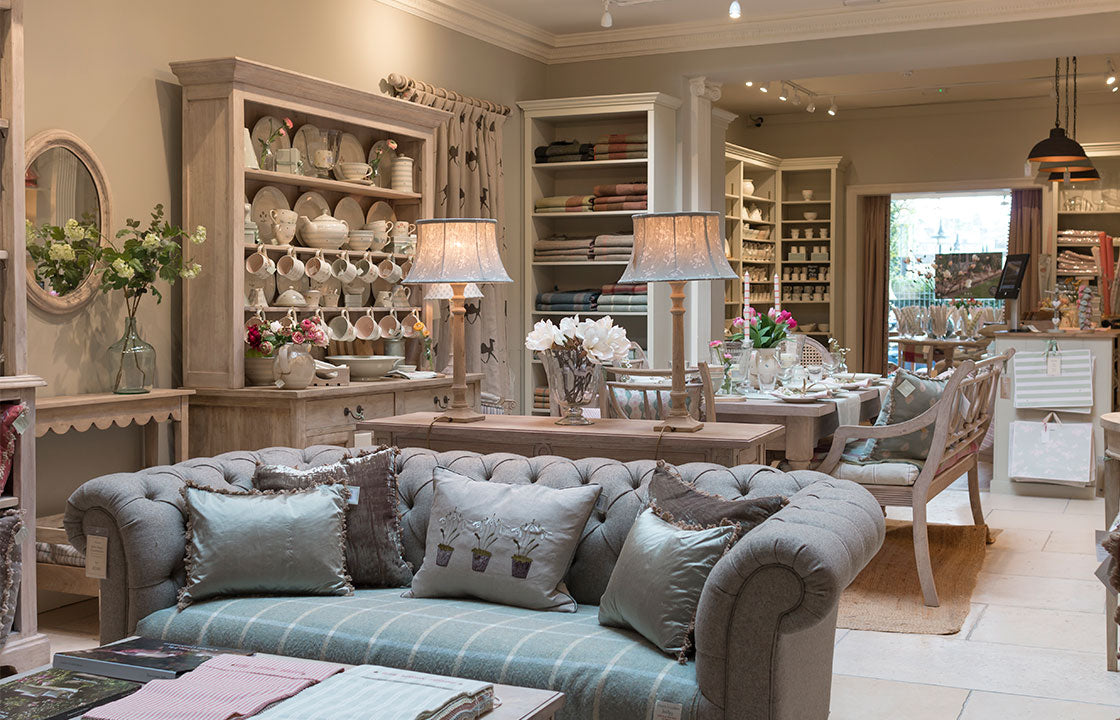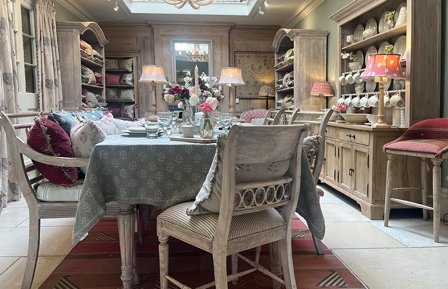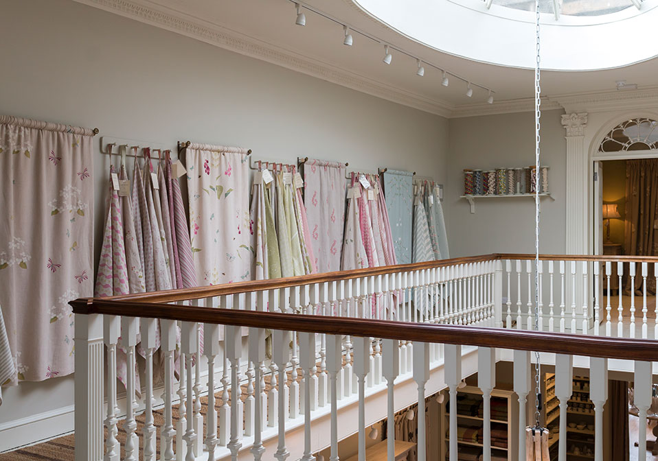 Our Harrogate showroom, has two staircases (one behind a secret hidden door!). Our full range of fabrics take pride of place on our Gallery Landing. A beautiful skylight above, makes it easy to view fabrics under natural light and discuss room schemes with our designers. A stunning dining area below, showcases our beautiful hand-carved furniture, hand-crafted ceramics, glassware and fine table linens.