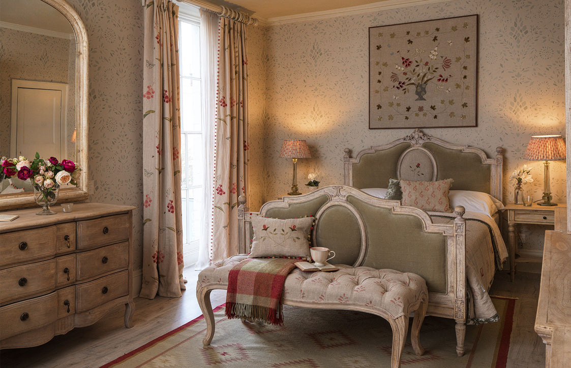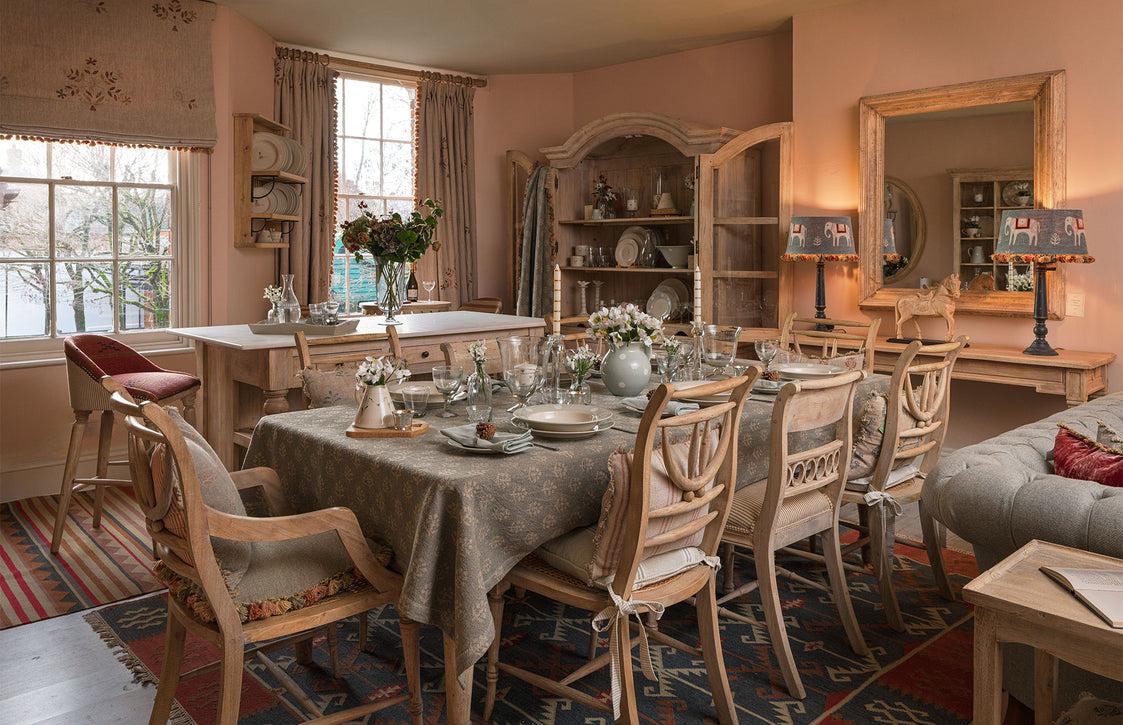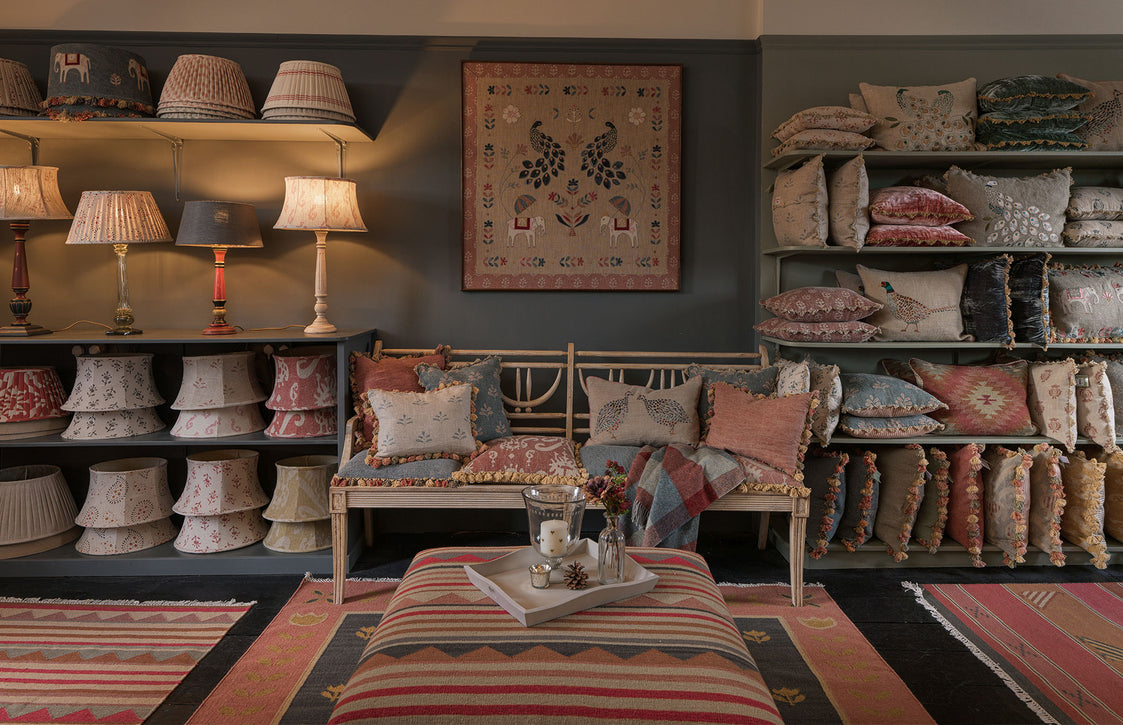 The store features a living/dining area, a tiled country kitchen showcasing our hand painted tiles, a cosy study painted in our new Egyptian Blue Paint and two large double bedrooms complete with our beautiful range of hand embroidered quilts. In January 2025 we opened up the top floor of the building, with a cushion library, bathroom, and rug room.
