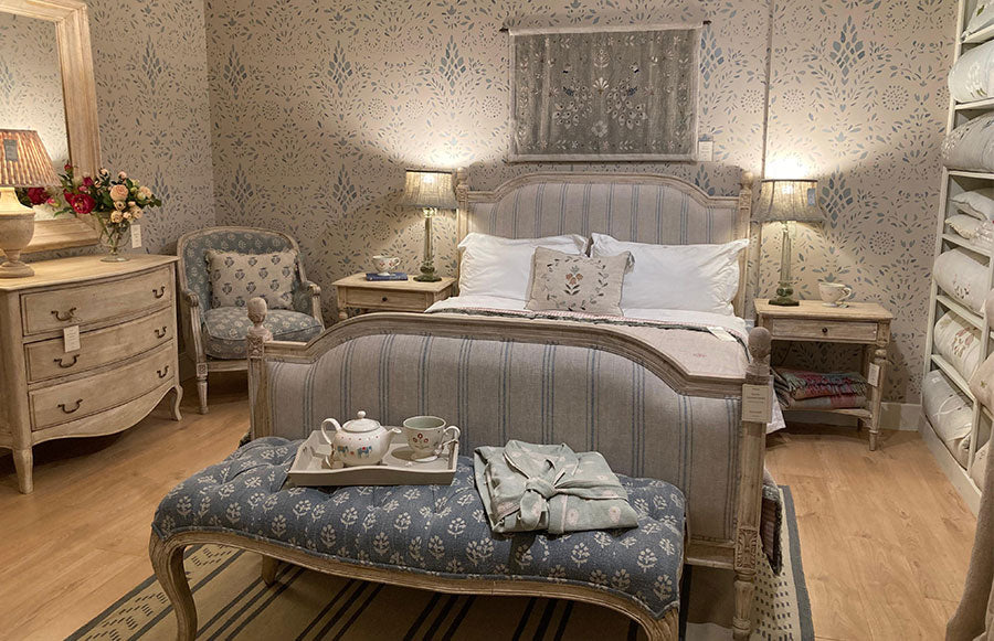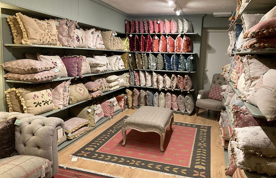 Downstairs is a beautiful bedroom featuring our Summer Blue Maja Wallpaper and Summer Blue Hartford Stripe Curtains, as well as our full range of Bed Linen. Walk through the bedroom into our extensive Cushion Library, where you can create your perfect cushion combination.